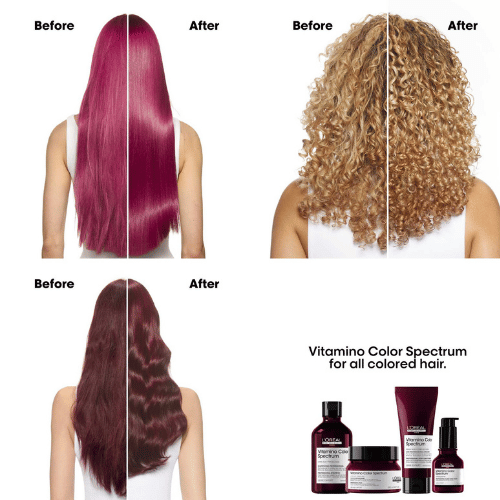L'Oreal Professionnel Vitamino Color Spectrum Mask er en intensiv plejemaske til farvet og afbleget hår, der har brug for dyb næring og maksimal farvebeskyttelse. Masken er udviklet til at bevare hårfarvens intensitet fra dag 1 i op til 100 dage, så farven holder sig levende og klar langt længere mellem dine behandlinger.