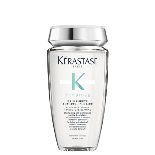 Kérastase Symbiose Bain Pureté Anti-Pelliculaire er en langtidsvirkende skælshampoo, udviklet til olieret og sensitiv hovedbund med tendens til skæl. Skæl opstår, når hovedbundens cellefornyelse accelererer, ofte forårsaget af overvækst af svampen malassezia. Dette fører til ophobning af døde hudceller, der bliver synlige som skæl.